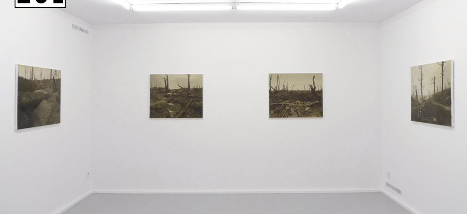 Les peintures présentées dans cette exposition ont été réalisées à partir de documents photographiques de la guerre de 1914-1918 : champs de bataille ravagés, chevaux de frise et barbelés, trous d'obus, tranchées, arbres mutilés dont les branches jonchent le sol, reflets dans des eaux mortes. Même si ces œuvres, au premier regard, semblent très réalistes, la démarche artistique de Myriam Bucquoit réside moins dans le choix de l'image – le « sujet » du tableau – que dans ce qui préside à ce choix et s'accomplit par les moyens de la peinture : suppression de toute présence humaine (ou animale) ; élaboration d'un espace disloqué ; monochromie source de lueurs sourdes ou d'ombres insondables ; matité et textures lignieuses, concassées ou étales. Des paysages donc, fossilisés, théâtres de désastres passés ou à venir qui diraient la « puissance du négatif ».